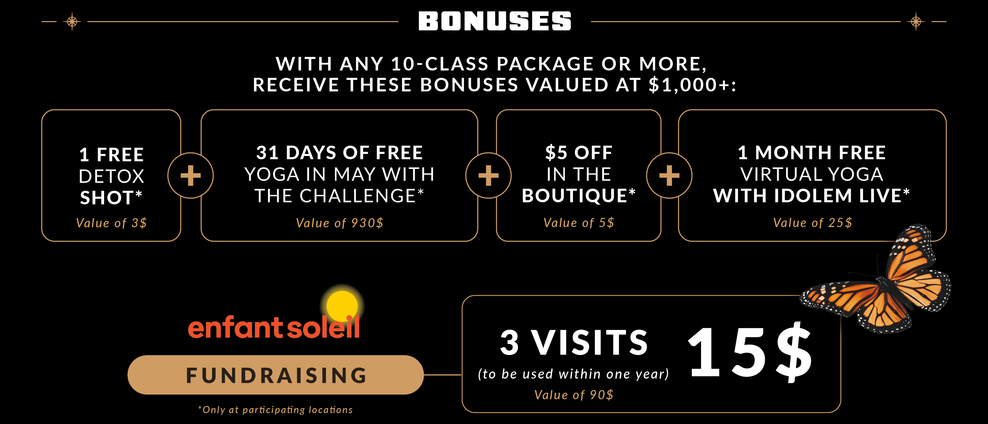 Our new students are invited to explore the IDOLEM universe in all its richness, at a lower cost. Each visit includes a Hot yoga class, for strengthening the body and appease the mind, as well as access to Yogic Spa Circuit : Intent card, refined tea, halotherapy, cold bath and relaxation lounge. One soft and bright entrance to your wellness.Your journey starts here, in the Warmth and kindness of IDOLEM.