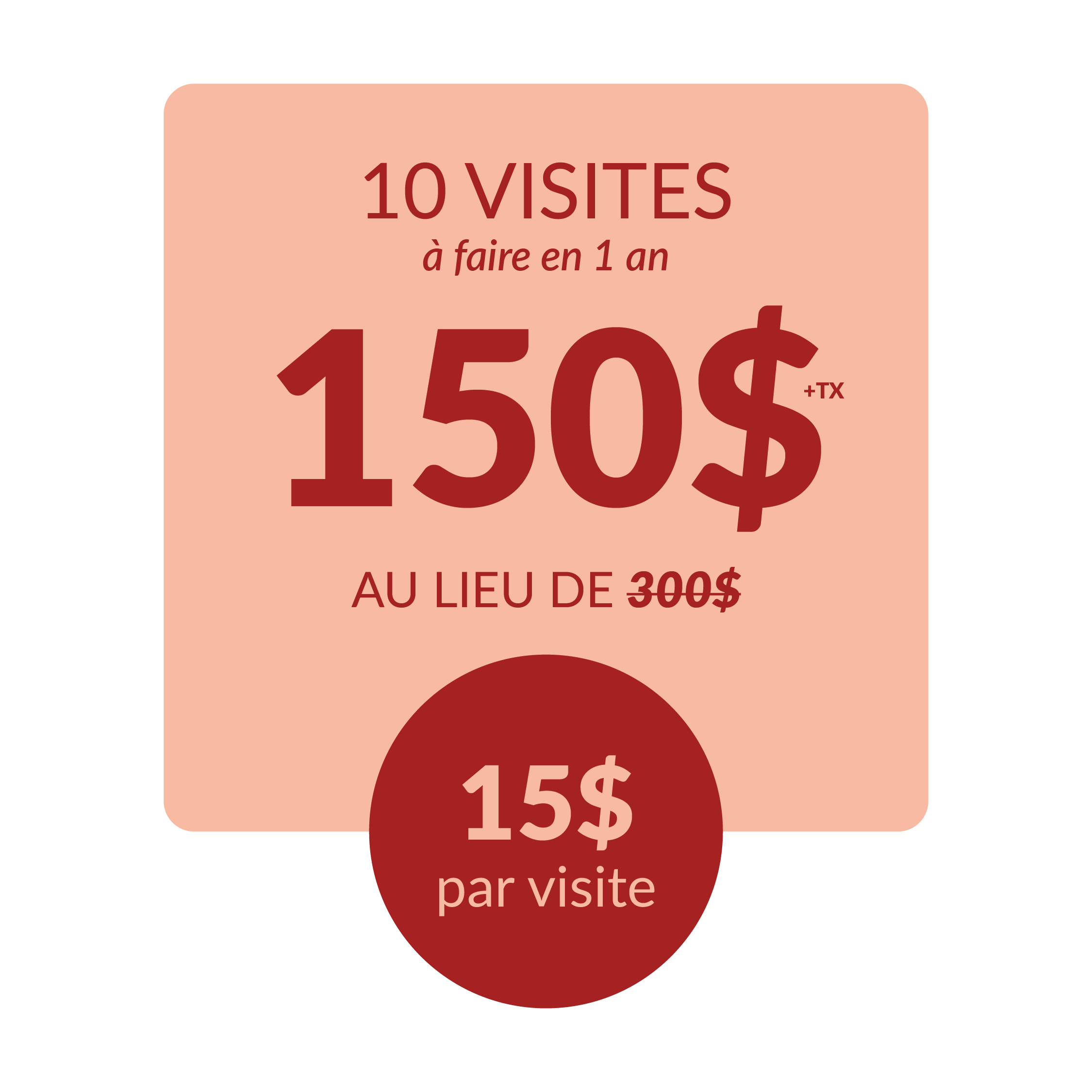 Termes et conditions : Prix valides seulement du 9 au 16 février 2026. Forfaits cumulable 10 et 50 visites : À faire en 1 an.